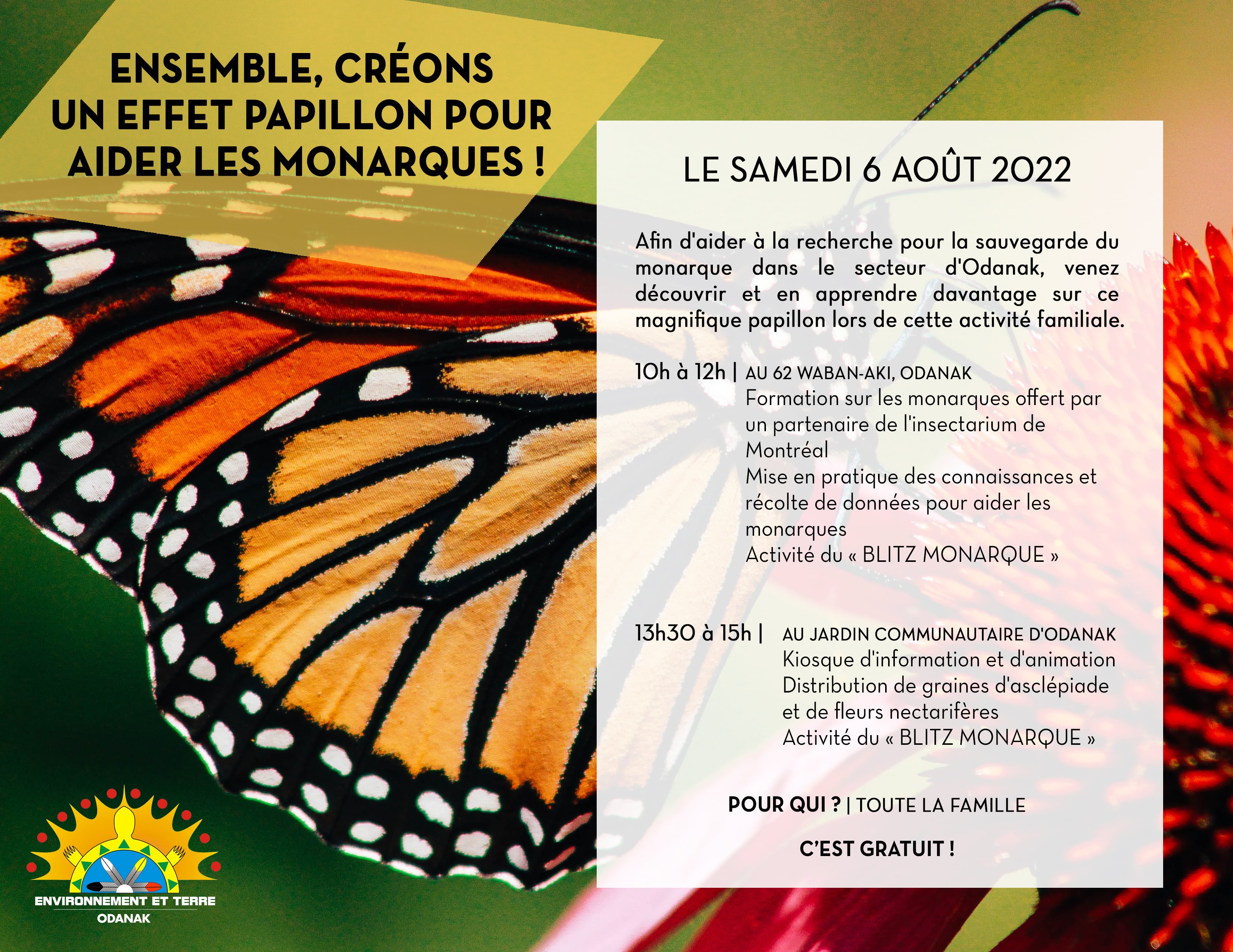 Three booths will be set up by GRAME in Lachine, Dorval, and the South-West! Visit them to learn more and ask your questions about monarch migration and life. All necessary materials for embarking on the mission and starting the identification of monarchs and milkweed will be provided! For more information, here is the link to the Facebook event.